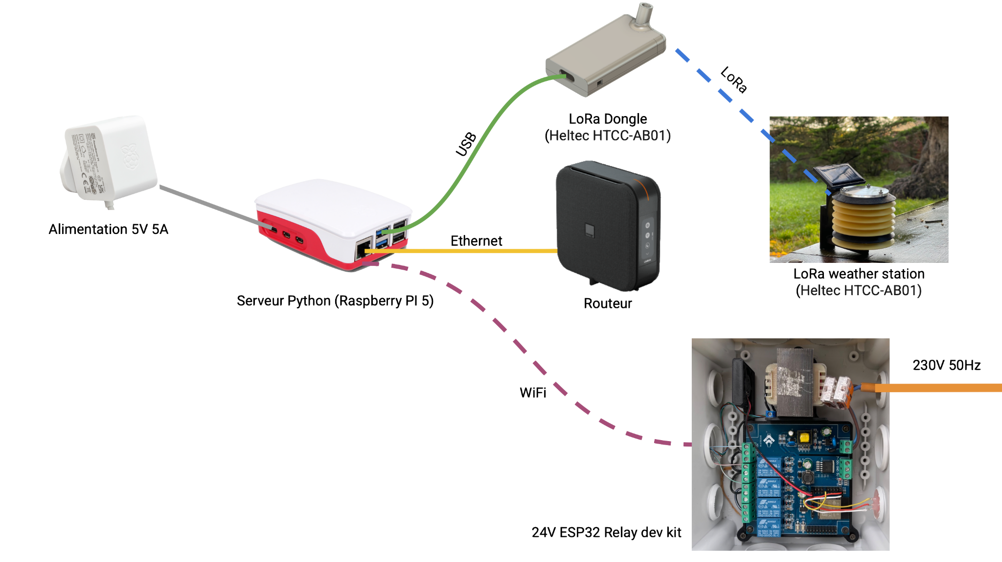 Le schéma ci-dessous explicite les différentes interactions Hardware au sein du système Arrosage Automatique :