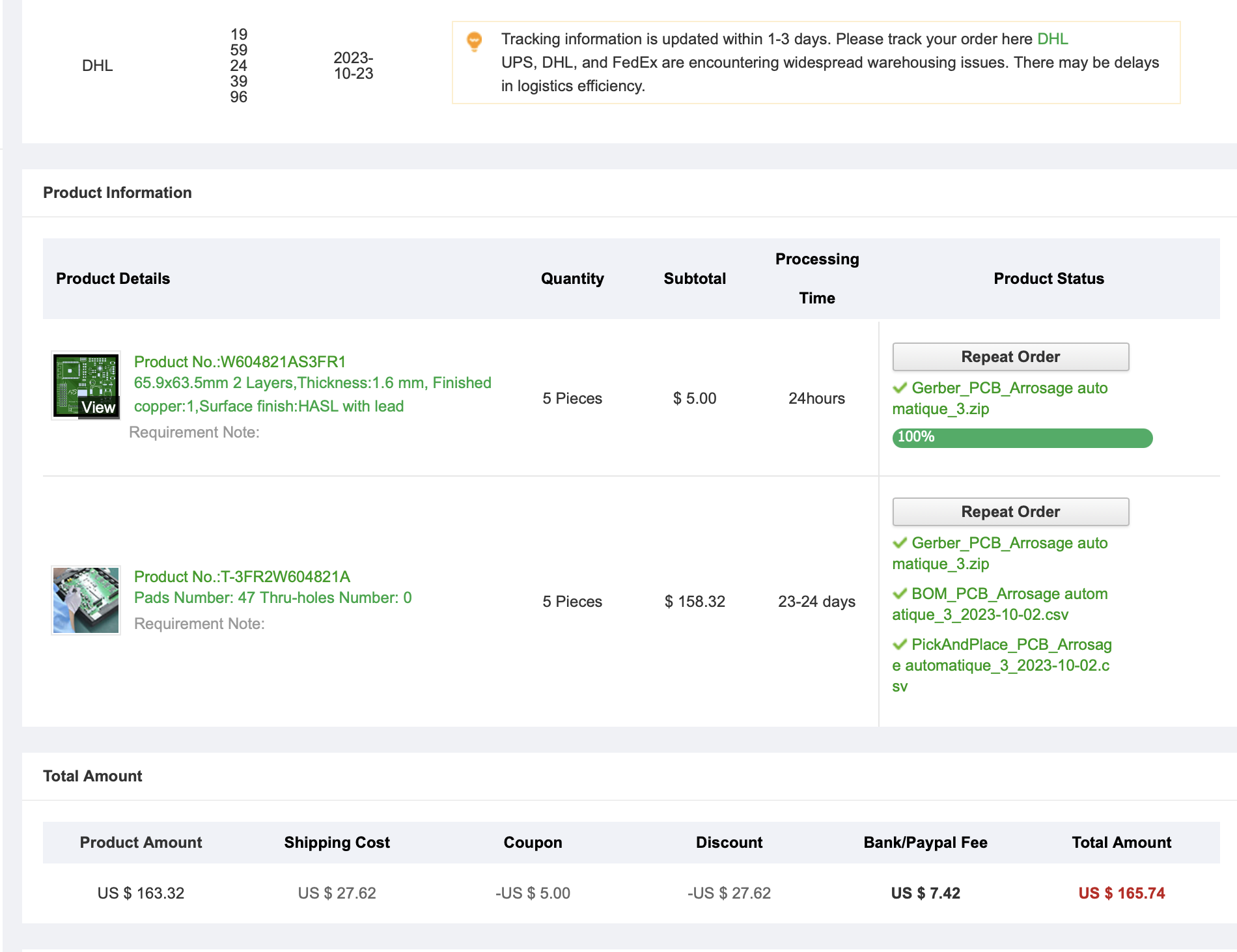 Ne disposant pas du matérial necessaire, j'ai donc fais appel à une entreprise de fabrication et d'assemblage de cartes electroniques. Afin de permettre la réalisation de ma carte, j'ai du fournir l'ensemble des documents nécessaires à sa fabrication (BOM, fichier Gerger, pick and place...). J'ai également pu contrôler chaque étape de fabrication grâce à une communication régulière (en anglais) avec le fournisseur.