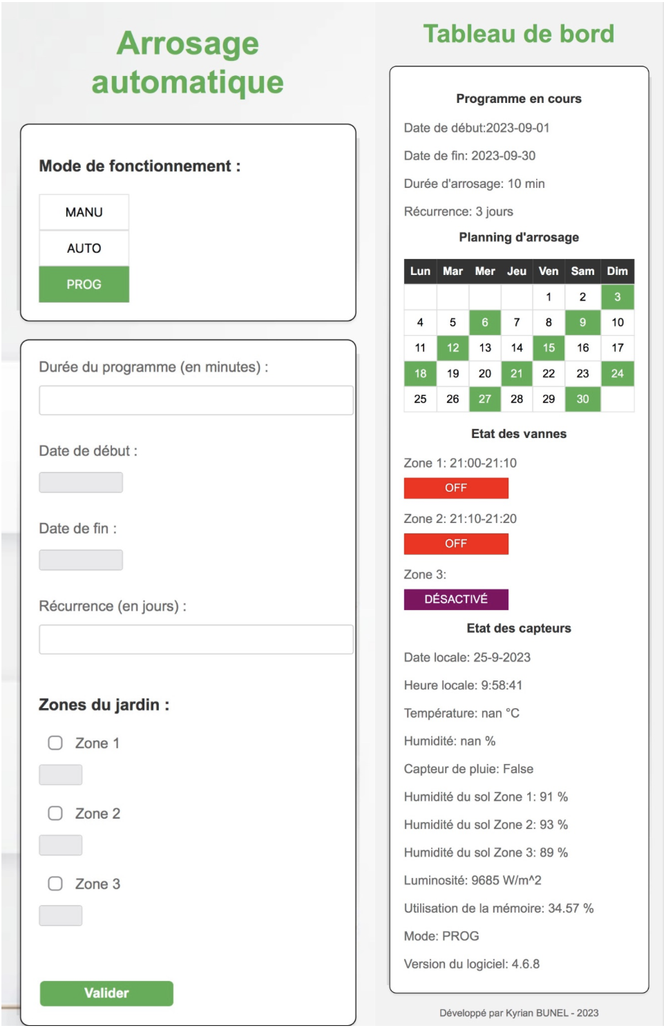 Ci-contre une capture d'écran des deux pages hebergé par l'arrosage automatique, une page d'accueil (à gauche) qui permet de modifier les réglages d'arrosage et un tableau de board (à droite) qui affiche toutes les informations utiles ralatif au programme en cours.