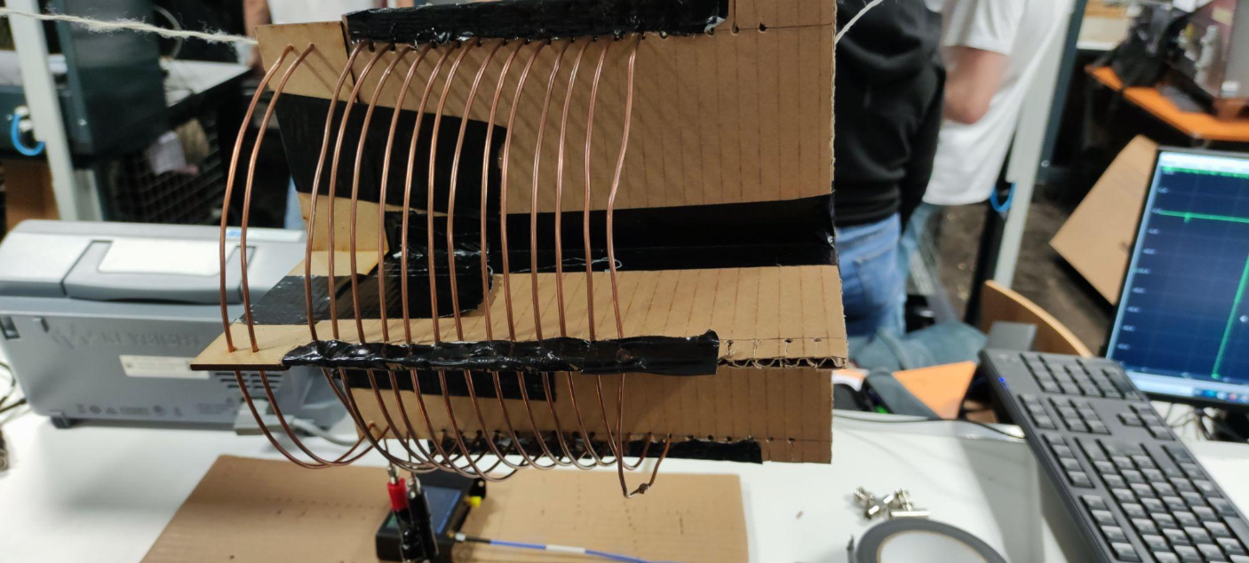 Après avoir effectué tous les paramètres, la bobine a été alimentée. Cependant, lors des premiers tests avec une LED, cette dernière ne fonctionnait que lorsqu’elle était placée entre les spires de la bobine. De plus, elle ne restait pas allumé longtemps.