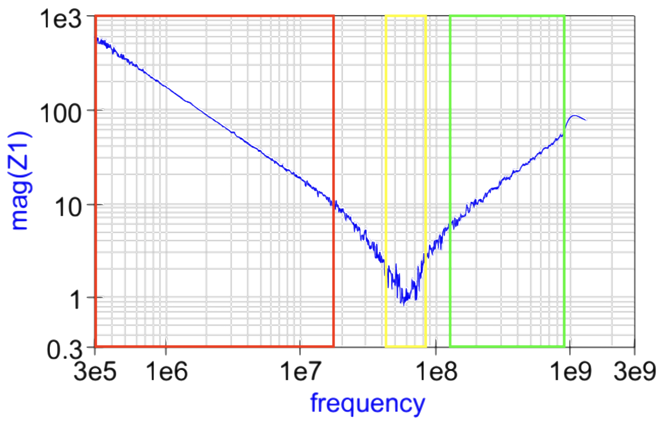 En fonction de la fréquence, un condensateur peut avoir des comportements très différents, nous pouvons voir sur la réponse en fréquence ci-dessus qu'entre 300kHz et 20MHz (zone en rouge), le condensateur à un comportement capacitif, entre 100MHz et 1GHz (zone en vert), le condensateur adopte en comportement inductif et aux alentours de 60MHz se trouve sa fréquence de résonnance.