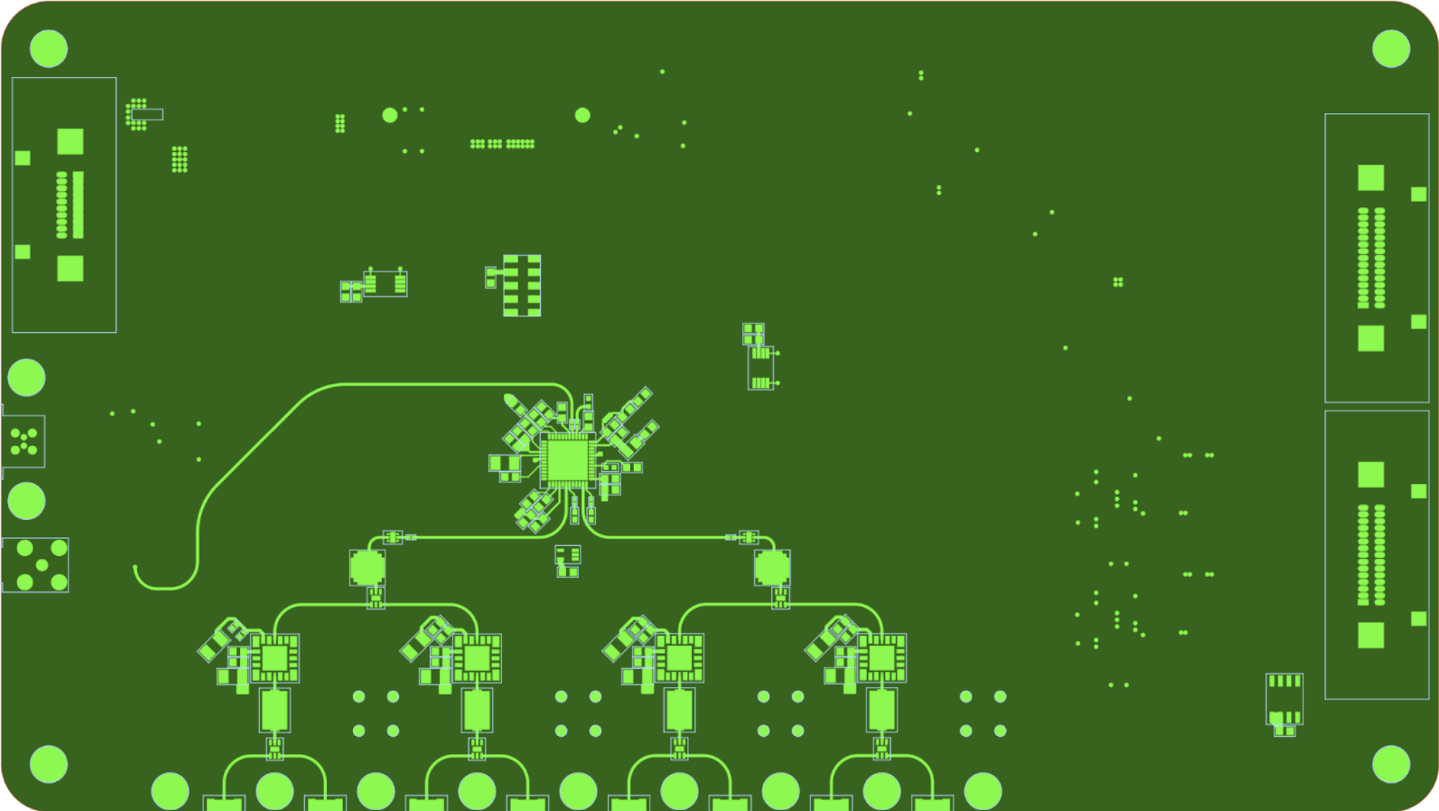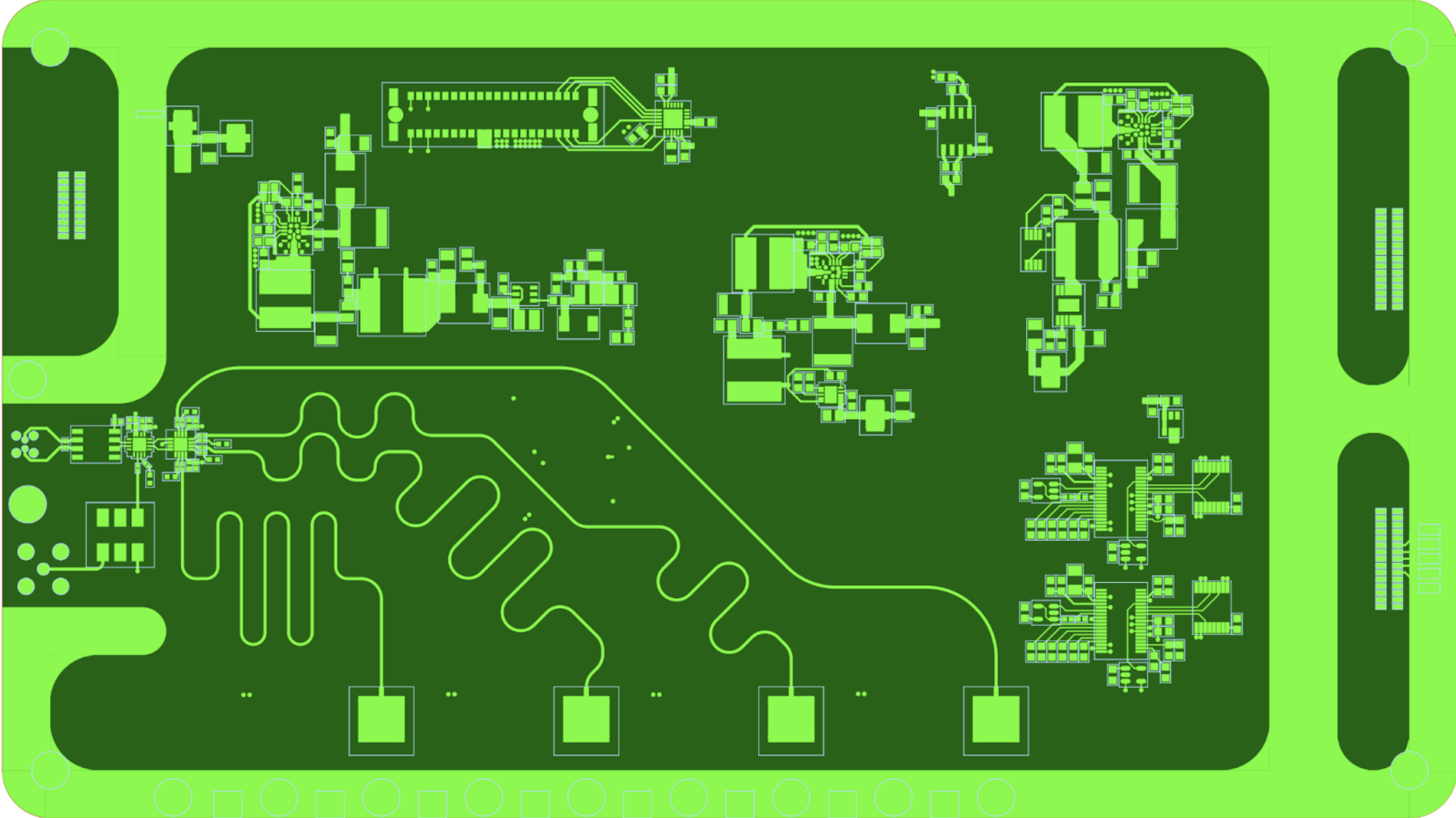 La couche BOTTOM (6) accueille la partie haute fréquence qui comporte la PLL ainsi que les filtres et amplificateurs haute fréquence. Cette partie nécessite une attention toute particulière car sensible au bruit et a un impact direct sur les performances de la carte.