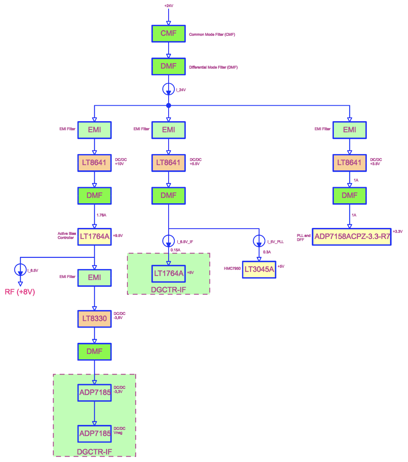 La seconde contrainte vient de la nature des composants à alimenter et des signaux RF. En effet, les composants à alimenter fonctionnent à haute fréquence ; la stabilité de l’alimentation est alors cruciale pour ce type d’applications tout en communiquant le moins de bruit possible. Il est donc primordial de sélectionner des composants à faible bruit (silencieux) et de mettre en place des filtres afin de fournir des tensions d’alimentation les plus propres possible.