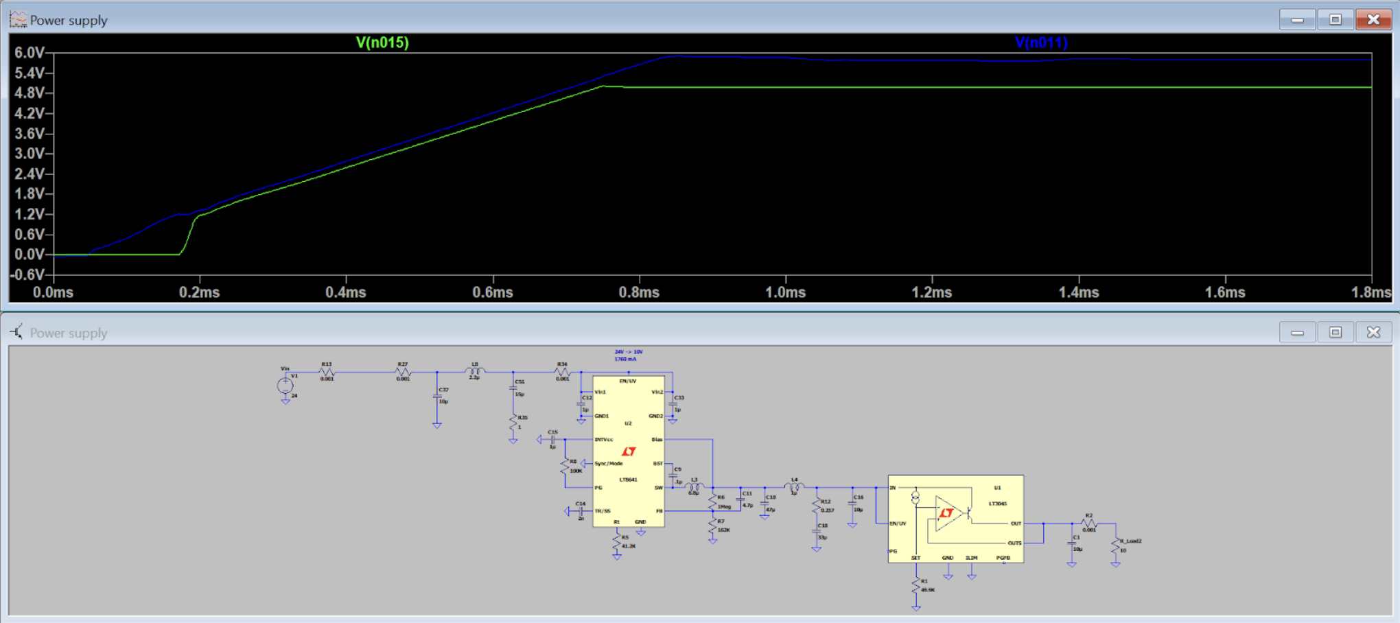Une fois toutes les parties conçues et simulées, je peux ensuite m’assurer du bon fonctionnement de la partie alimentation complète à l’aide de LTspice comme le montre la figure 11 ci-dessous: