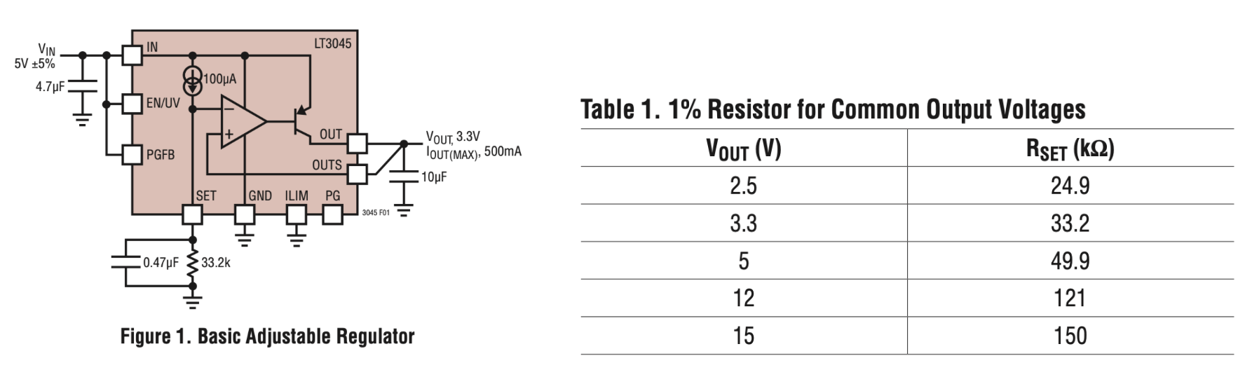 D'après la documentation du LT3045, la tension de sortie dépend de deux résistances et est définie par la relation suivante : VOUT=1.21(1+R2R1+3*10-6*R2) comme le montre la figure 6 ci-dessous: