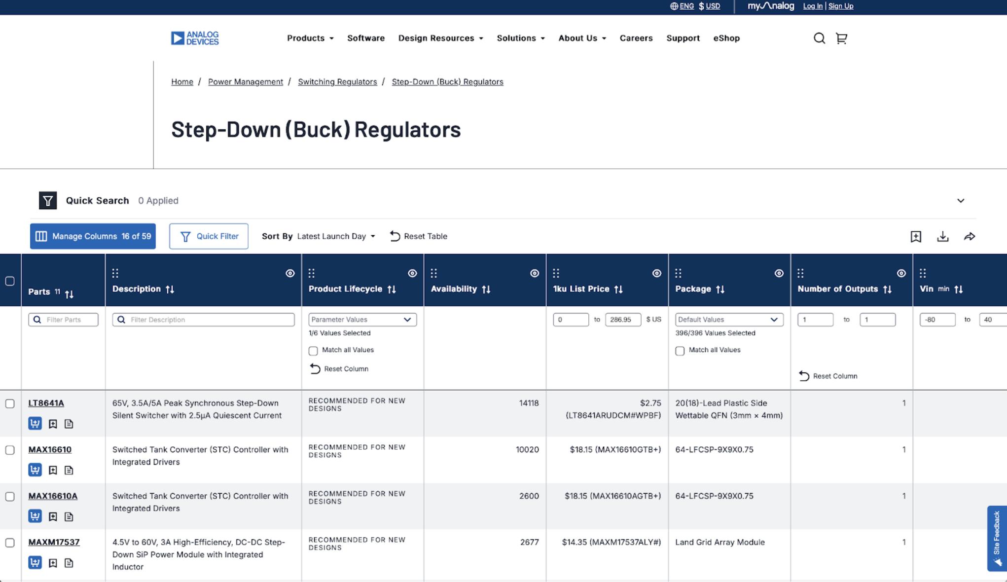 Afin de sélectionner le régulateur qui correspond au mieux à mon cahier des charges, parmi près de 2000 références, j’utilise les filtres de recherche du site d’analog devices et détermine les critères suivants :