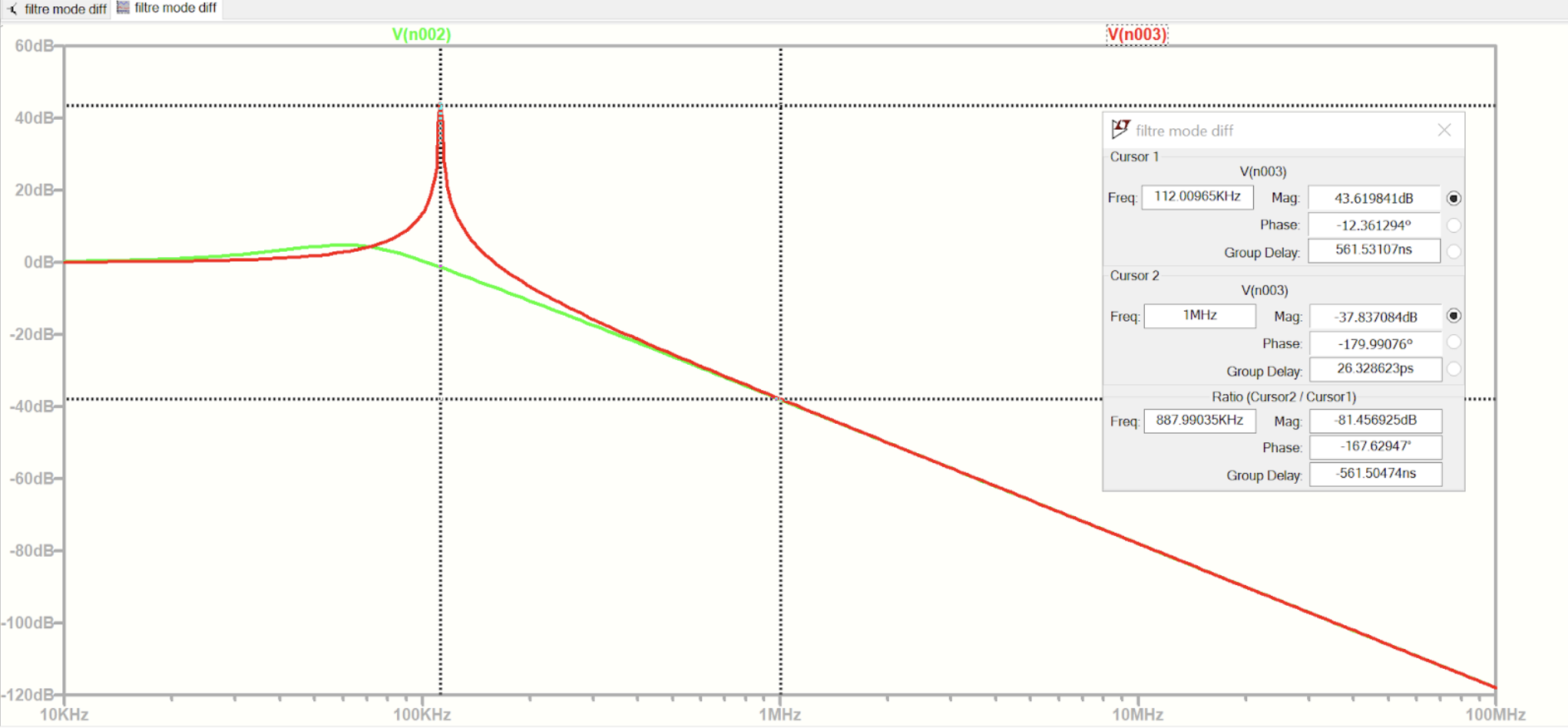 figure 9 : simulation du filtre seul (sans circuit d’amortissement en rouge, avec en vert)