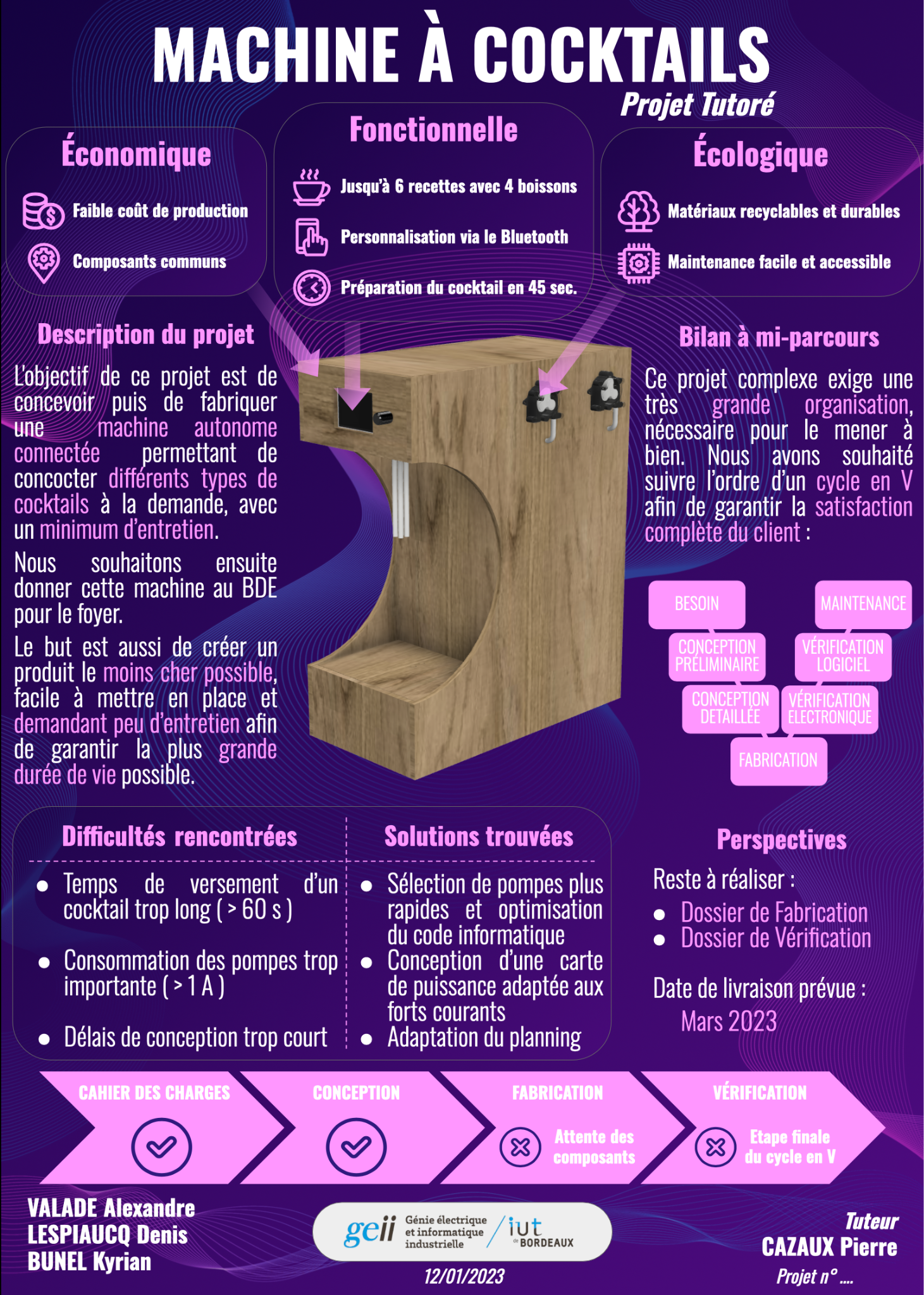 Ce poster offre un aperçu captivant de notre système, mettant en lumière les composants clés tels que les pompes péristaltiques, le capteur de poids, l'écran à cristaux liquides et toutes les fonctionnalisées de la machine. Il présente également notre vision d'une expérience de cocktail à la fois innovante et conviviale, susceptible de révolutionner l'art de la préparation des cocktails. Nous sommes impatients de partager notre passion pour ce projet et d'explorer comment il pourrait ouvrir de nouvelles perspectives passionnantes dans le domaine de la mixologie automatisée.