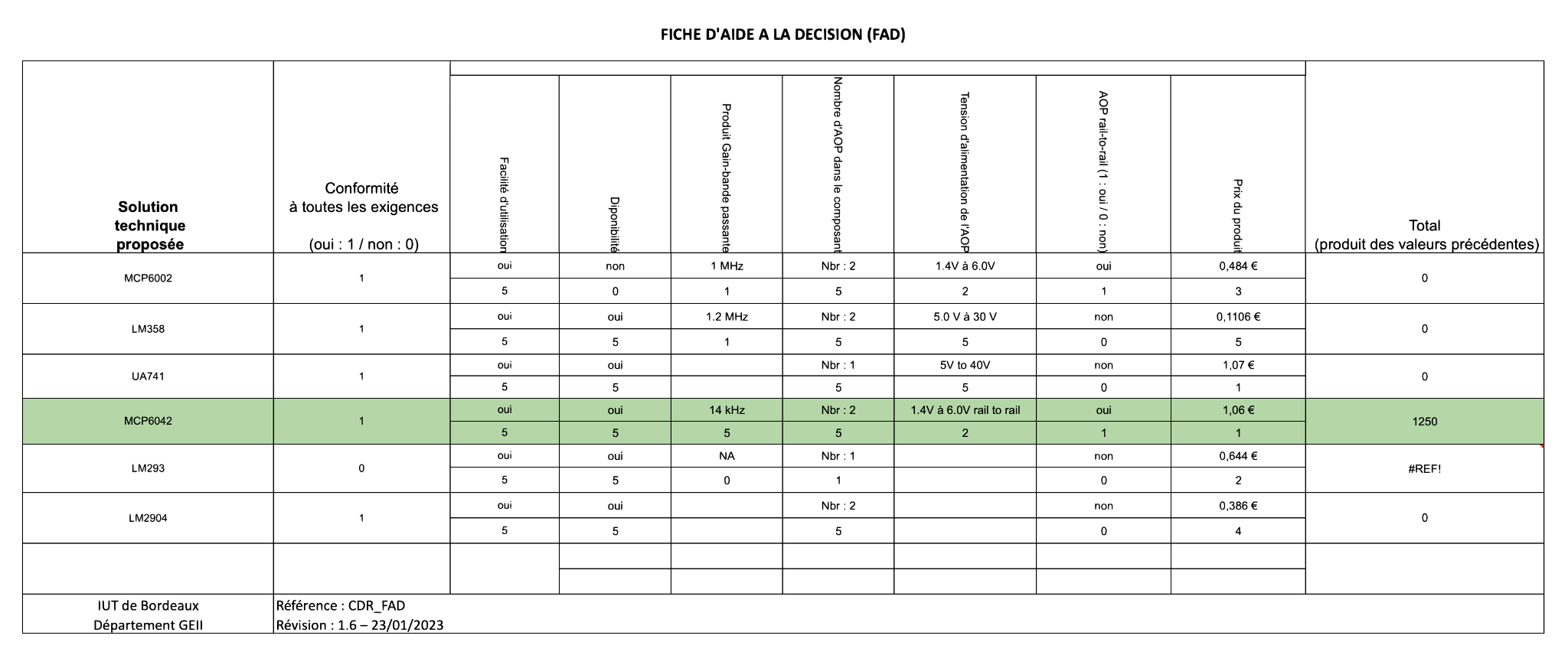 Une fiche d'aide à la décision permet de sélectionner parmi plusieurs solutions techniques proposées lors d'un brainstorming, la meilleure solution selon des critères établit en fonction du cahier des charges. Ce tableau permet donc de comparer les caractéristiques importantes des composants en se basant sur leurs datasheet afin de correspondre au mieux au projet.