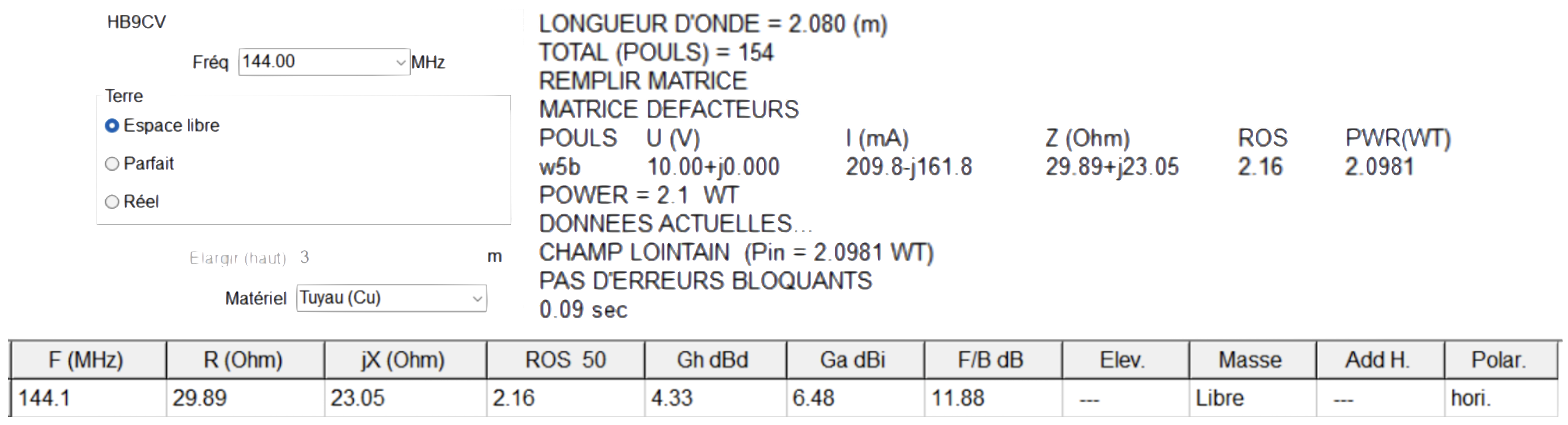 Après avoir modélisé l'antenne et renseigné sa fréquance de résonance (144.0 MHz), nous pouvons ensuite relever les différentes caractéristiques théorique de l'antenne calculé par MMANA, ses données sont repertionées dans le tableau ci-dessous.