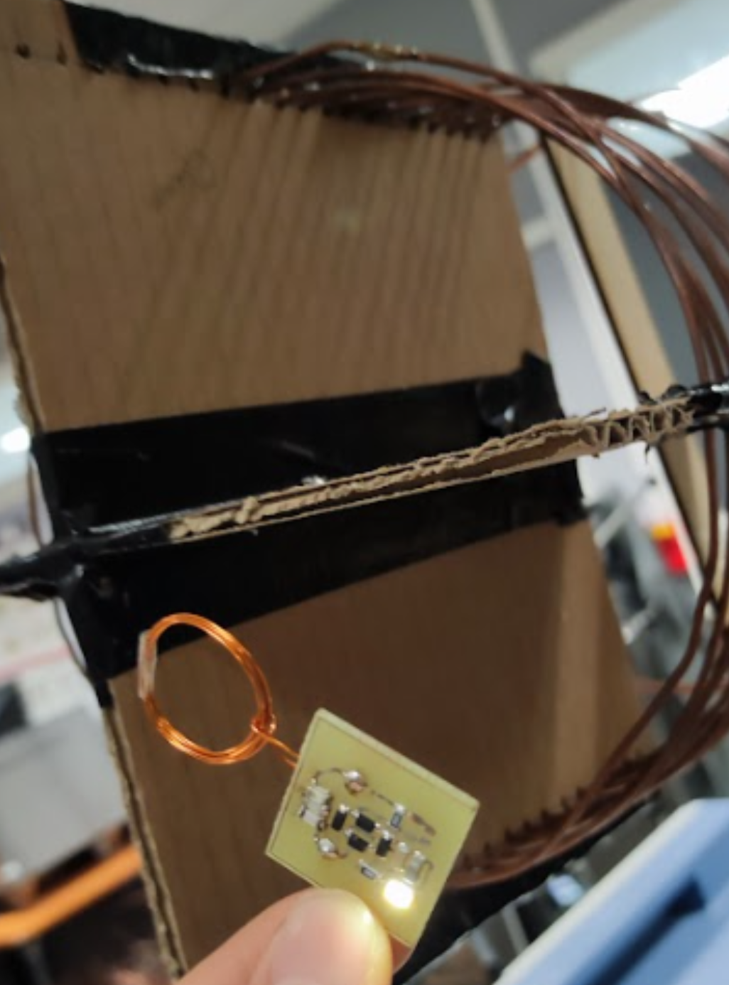 Après avoir effectué tous les paramètres, la bobine a été alimentée. Cependant, lors des premiers tests avec une LED, cette dernière ne fonctionnait que lorsqu’elle était placée entre les spires de la bobine. De plus, elle ne restait pas allumé longtemps.
