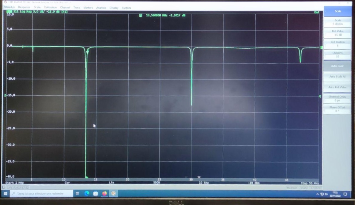 Lors des tests, la fréquence RFID a bien été atteinte. Le VNA a été l’outil qui nous a permis de vérifier si la fréquence 13.56 MHz a été atteint.