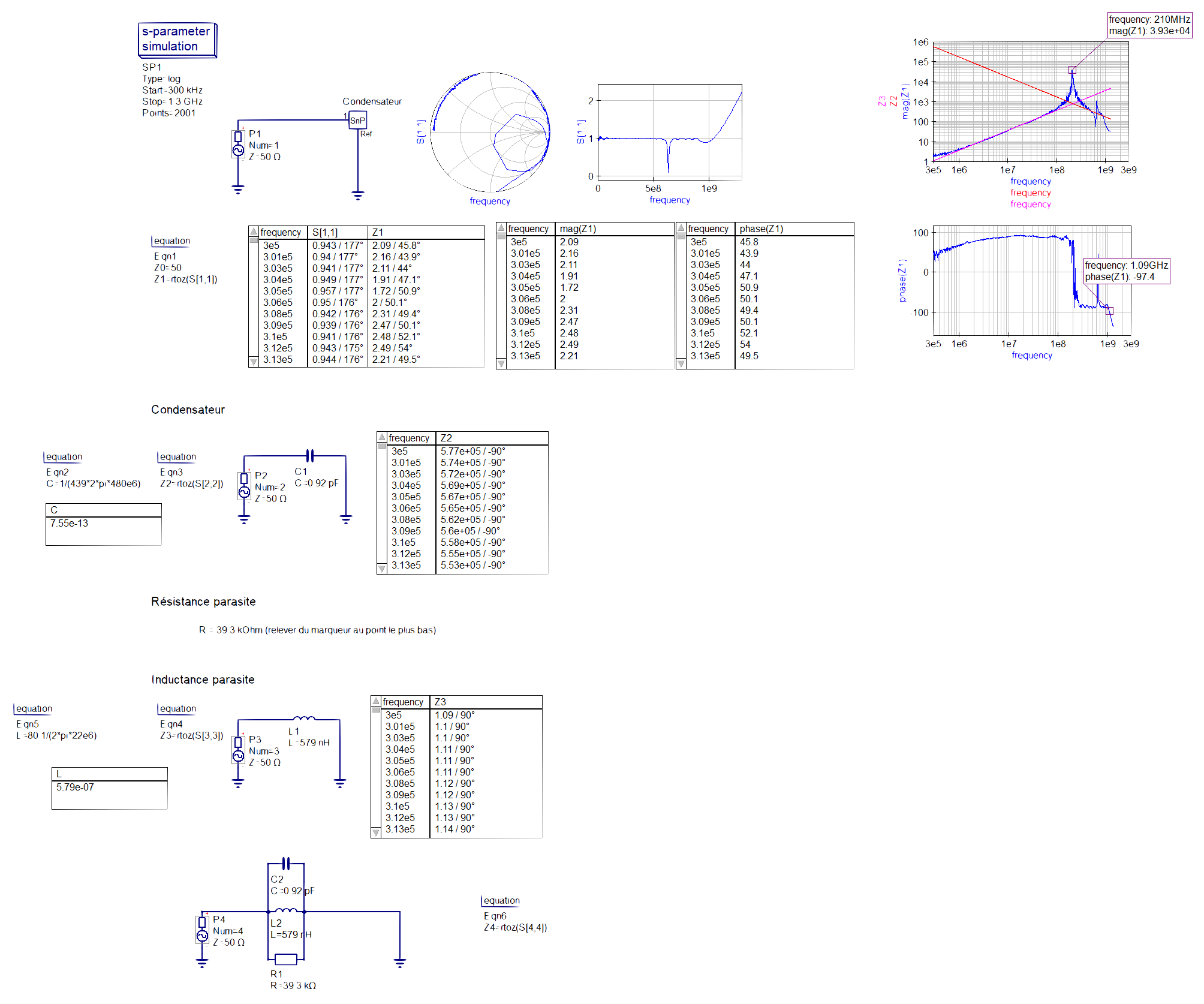 La quatrième partie consiste à calculer l'inductance parasite du condensateur se fait à l'aide d'un point judicieusement placé comme expliqué précédament, et de la formule de l'impédance d'une bobine : L = R/ω = 11/2*pi*212e6 = 8,26nH.