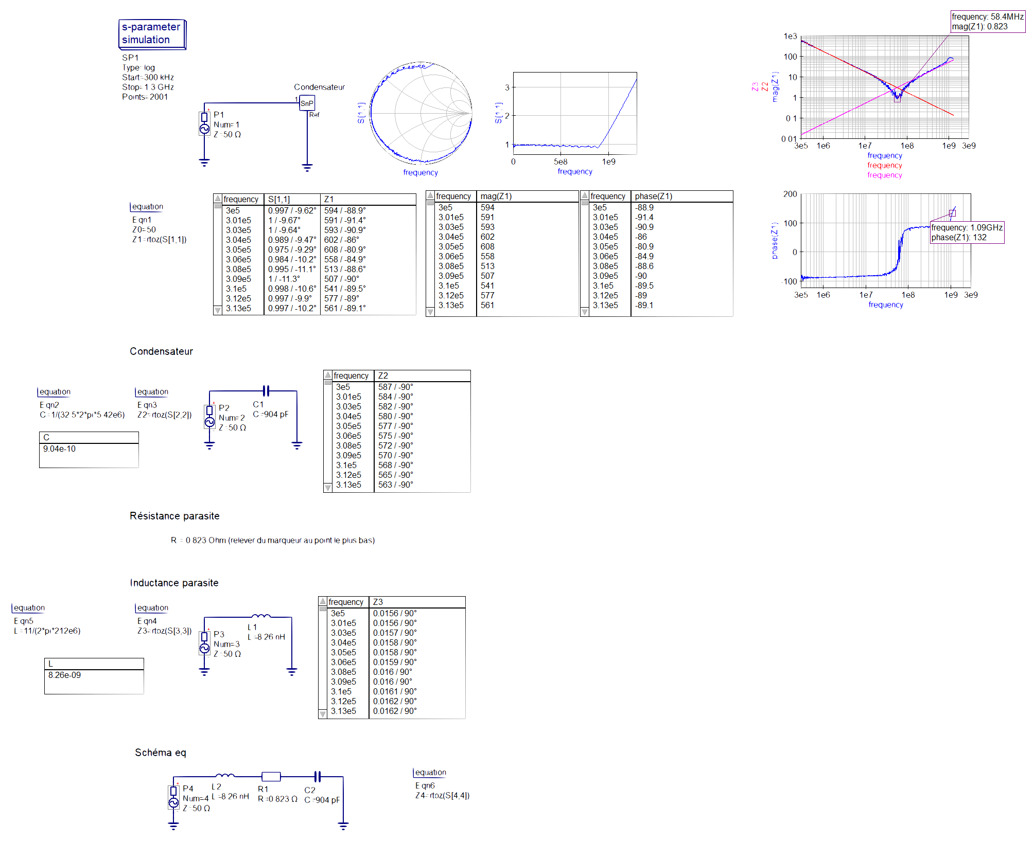 La quatrième partie consiste à calculer l'inductance parasite du condensateur se fait à l'aide d'un point judicieusement placé comme expliqué précédament, et de la formule de l'impédance d'une bobine : L = R/ω = 80.1/2*pi*22e6 = 579nH.