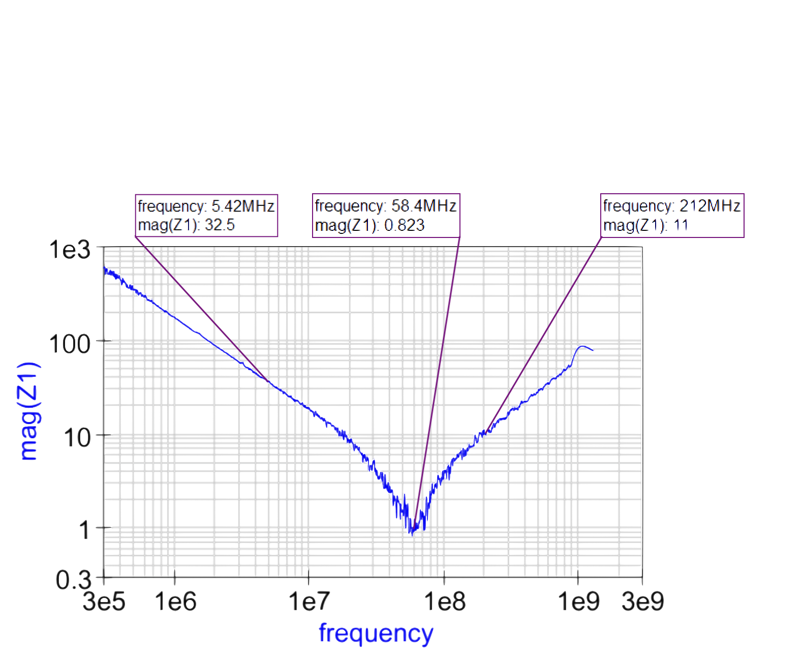 En fonction de la fréquence, un condensateur peut avoir des comportements très différents, nous pouvons voir sur la réponse en fréquence ci-dessus qu'entre 300kHz et 20MHz (zone en rouge), le condensateur à un comportement capacitif, entre 100MHz et 1GHz (zone en vert), le condensateur adopte en comportement inductif et aux alentours de 60MHz se trouve sa fréquence de résonnance.