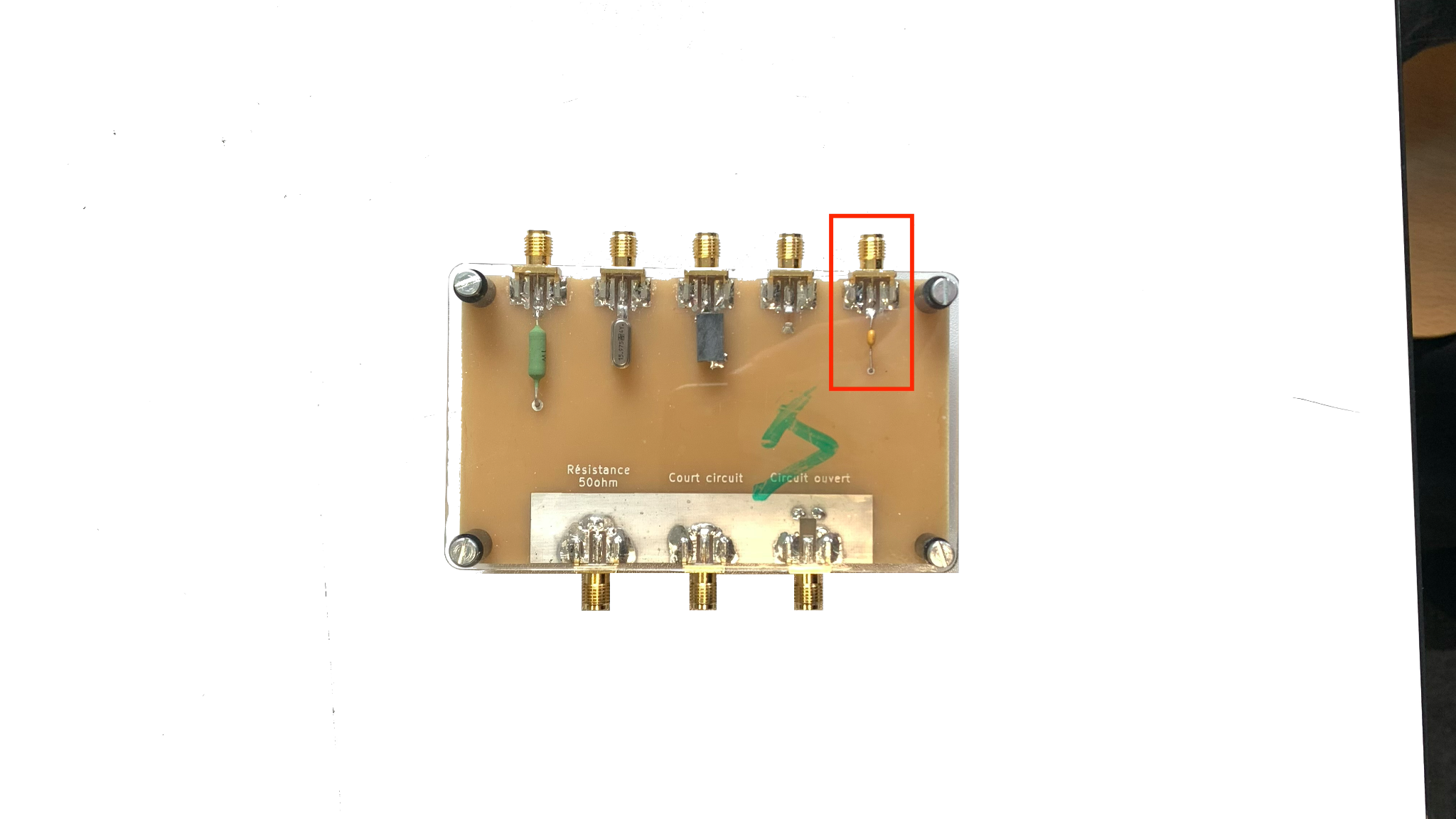 figure 5 : plaque de test avec le condensateur à caractériser (en rouge) et câblage au VNA