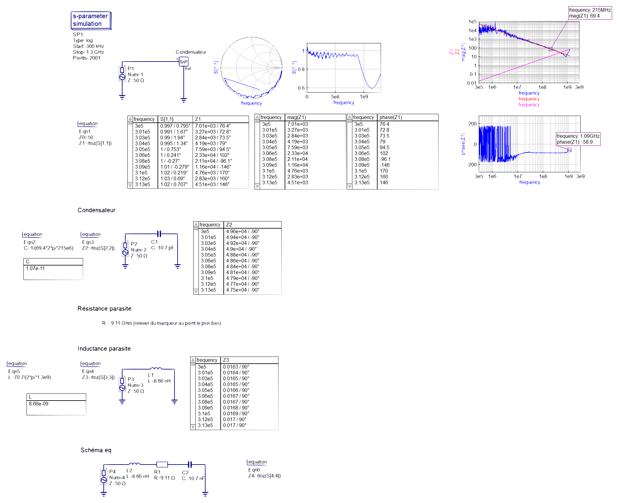 La quatrième partie consiste à calculer l'inductance parasite du condensateur se fait à l'aide d'un point judicieusement placé comme expliqué précédament, et de la formule de l'impédance d'une bobine : L = R/ω = 70,7/2*pi*1,3e9 = 8,66nH.
