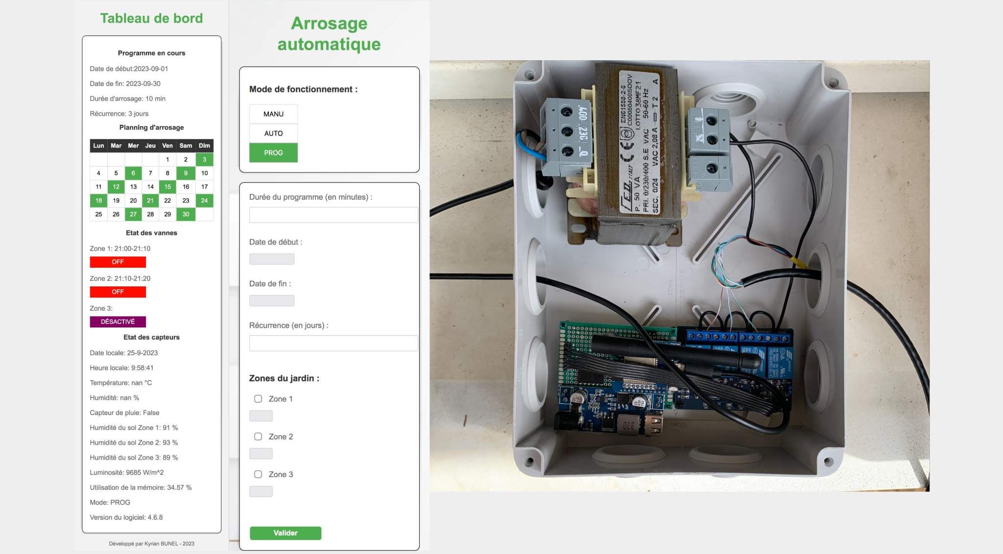 Mon projet le plus complexe à ce jour, un système d'arrosage automatique connecté au WiFi pouvant commander jusqu'à 6 zones indépendamment. Disposant de trois modes de fonctionnement dont un automatique qui utilise une station météo également réalisée par mes soins pour déclencher un arrosage au meilleur moment.