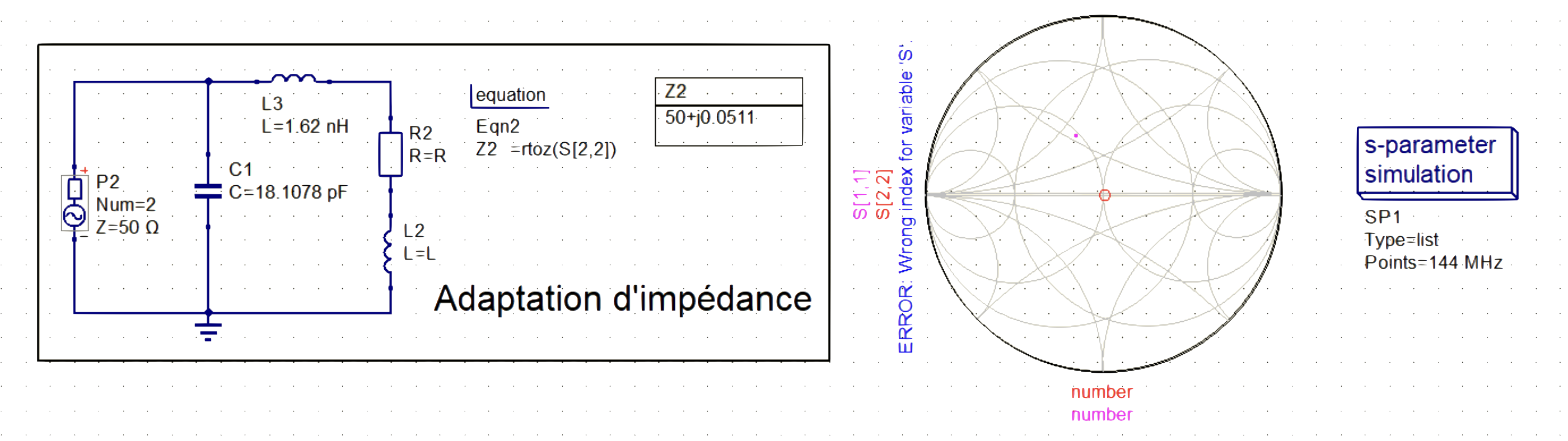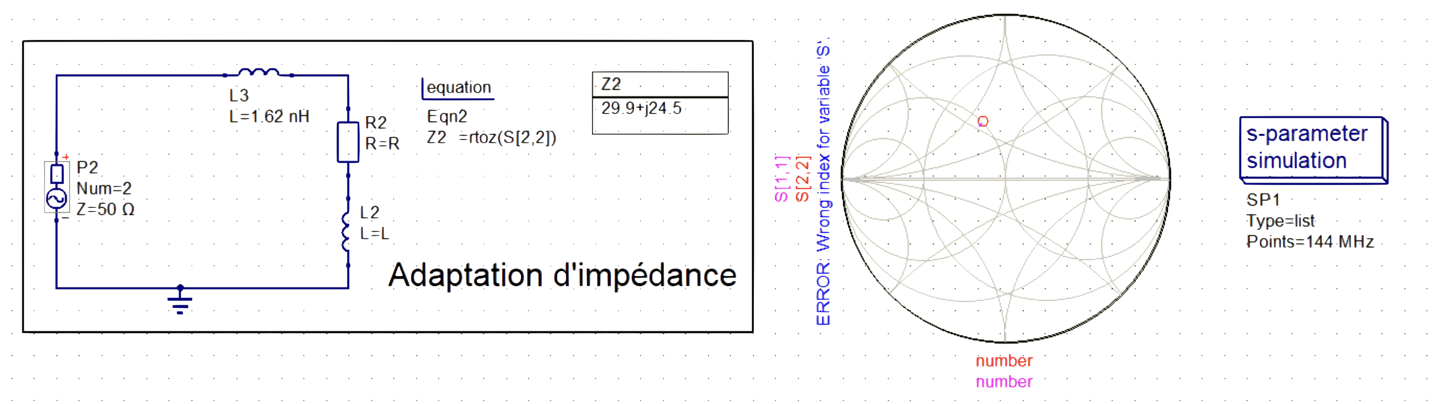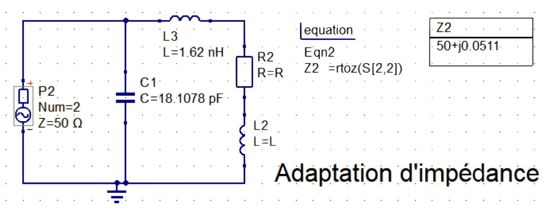 Nous avons ensuite rajouté une bobine en série pour se rapprocher du cercle d'admittance qui nous permettra d’atteindre le centre de l’abaque (qui correspond à l’adaptation d’impédance).